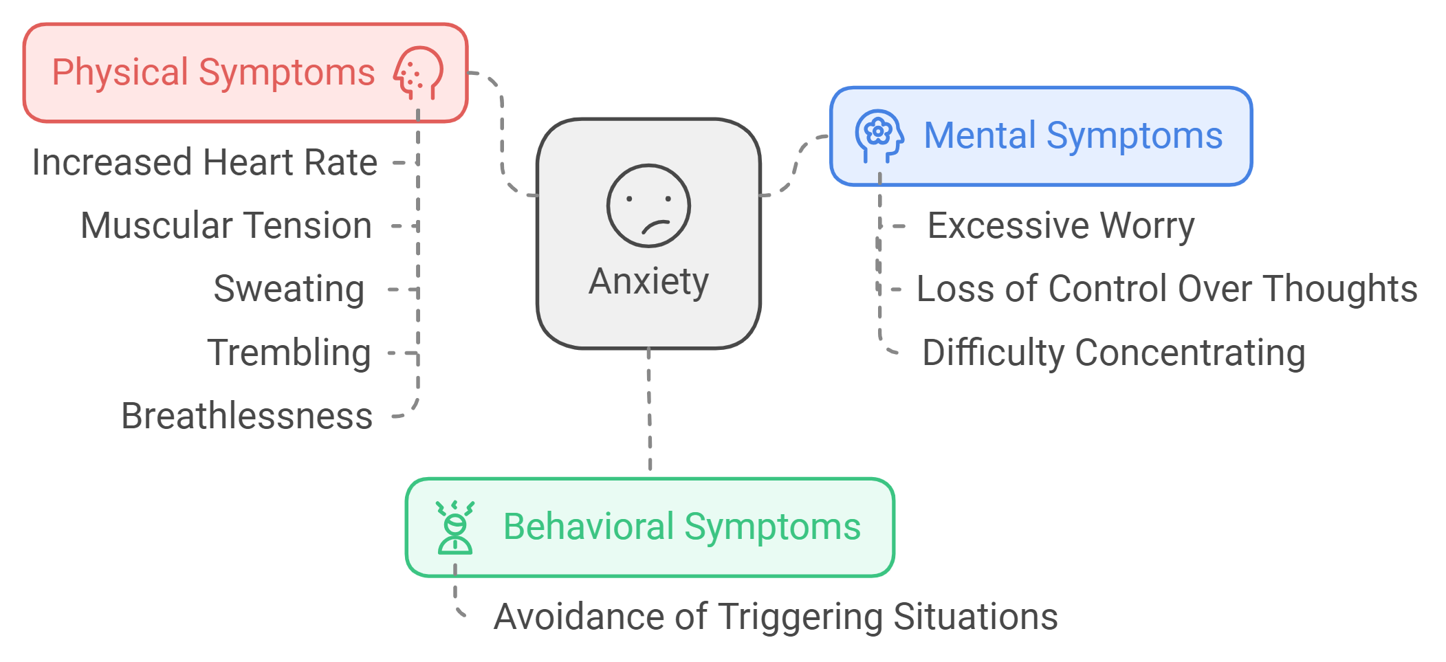 Anxiety is more than just a feeling; it also manifests in our bodies and influences our behaviour. When anxious, we experience various physical sensations, including: